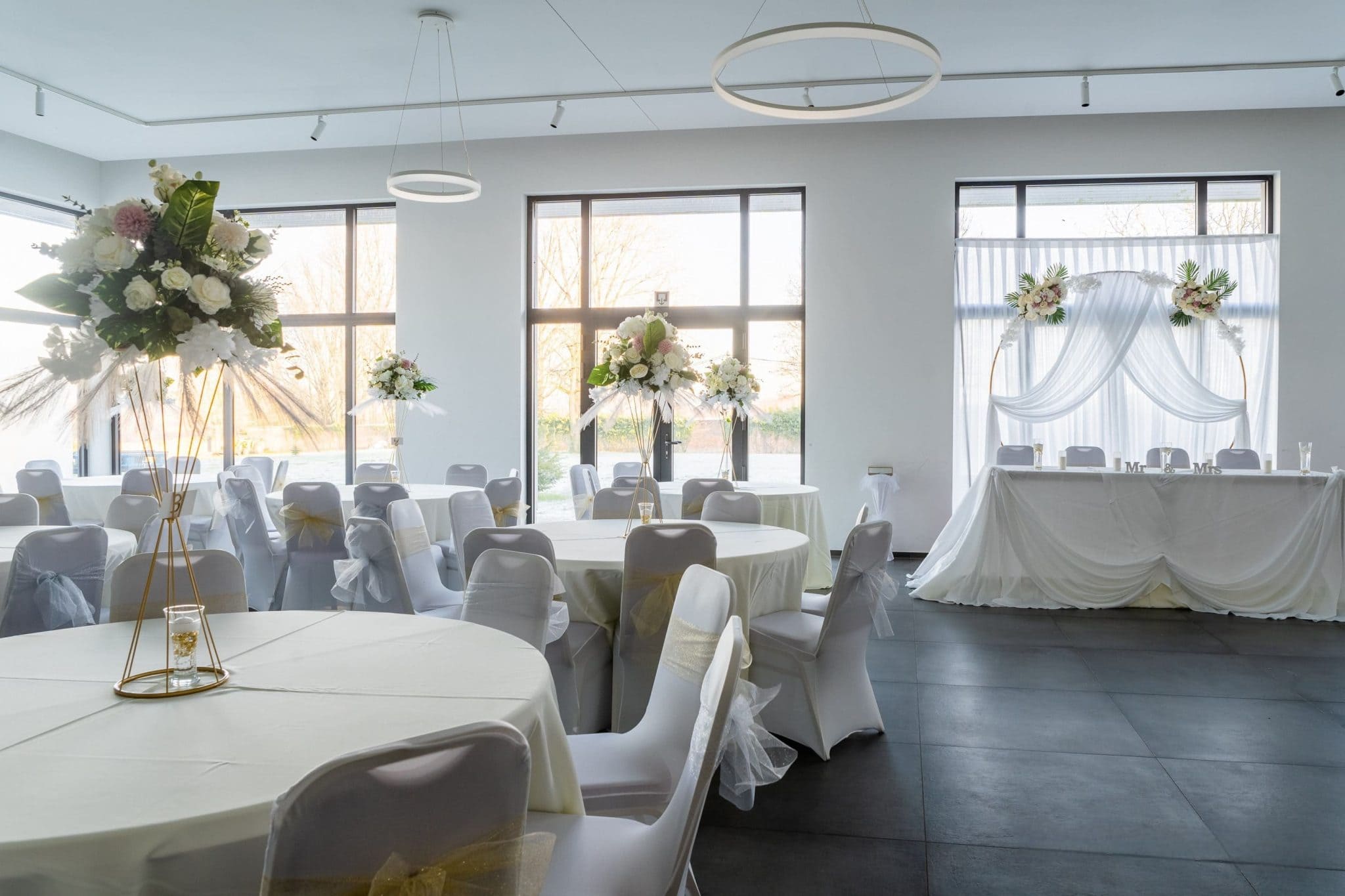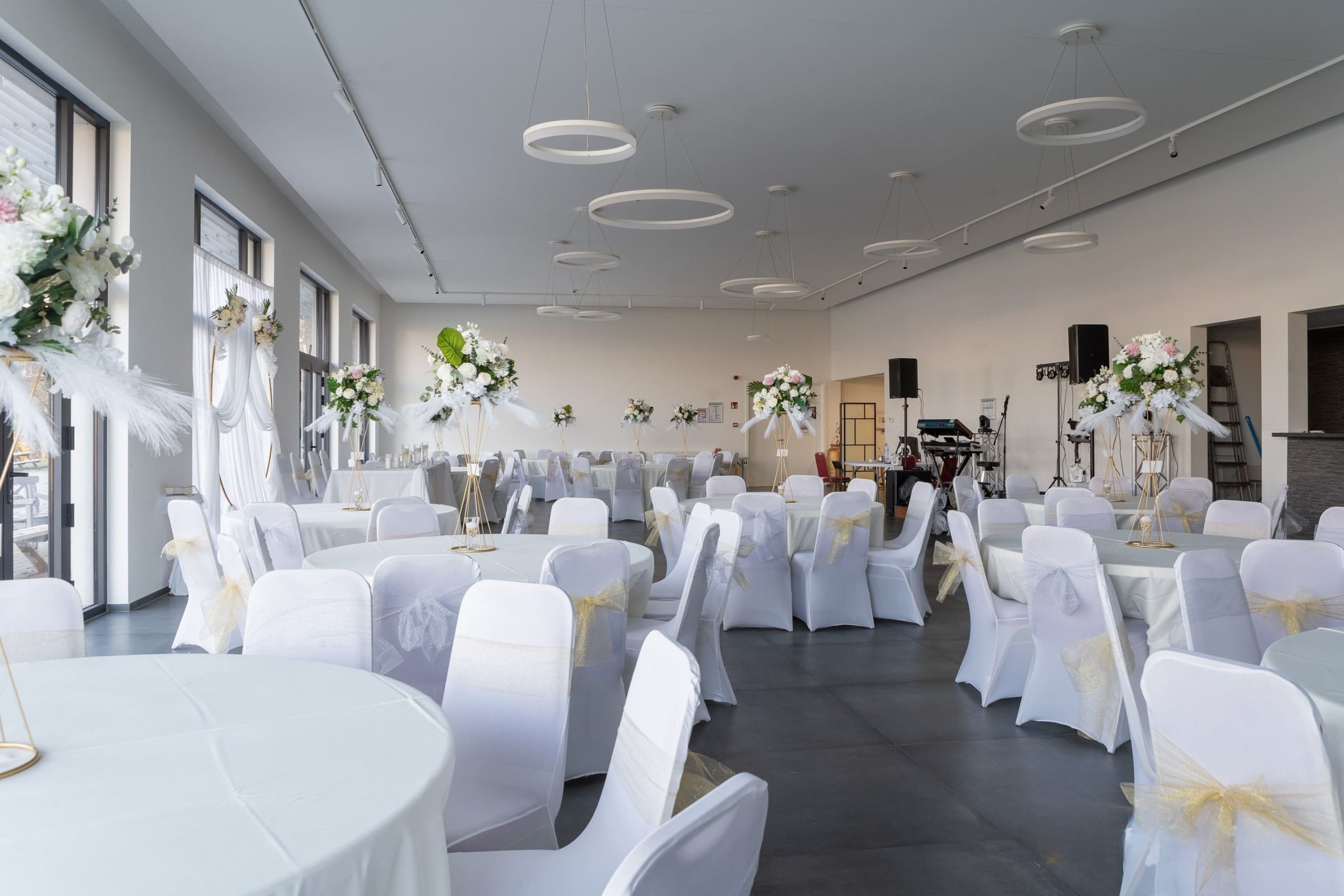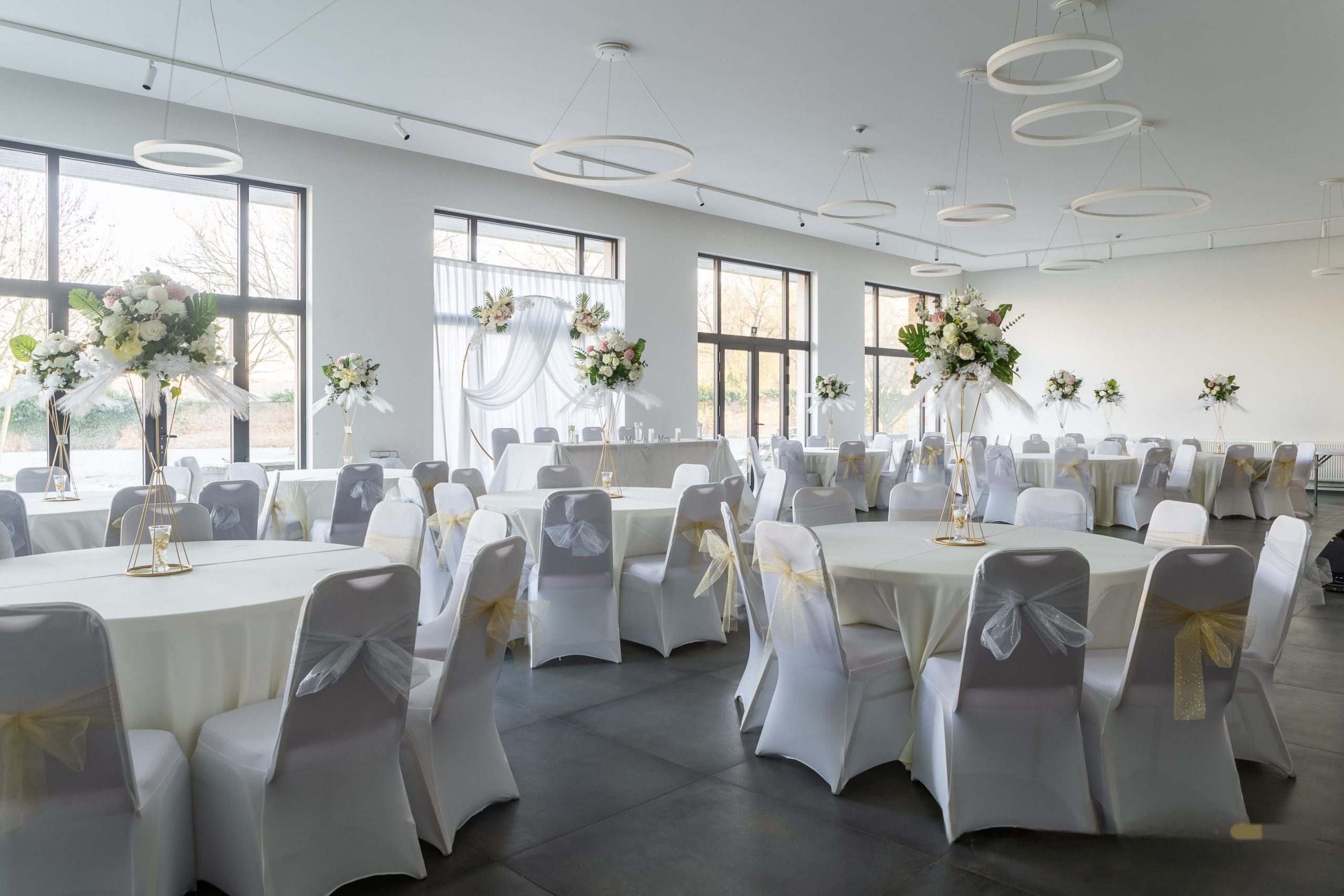 Budget tout inclus: Tables rondes ou rectangulaites selon votre choix + nappes couleur crème , chaises + housses de chaises, 18 mange-debout